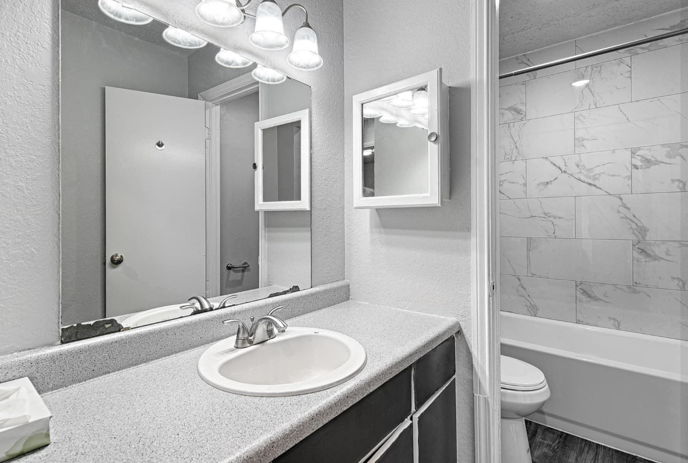 Experience the exceptional in this expansive 895 square foot one-bedroom apartment, featuring generous walk-in closets. Enjoy the elegance of granite countertops and stunning new tub surrounds in select units. Benefit from central heating and air conditioning, solar screens, dishwashers, and the latest stainless steel appliances available in select units. This is modern living at its finest.